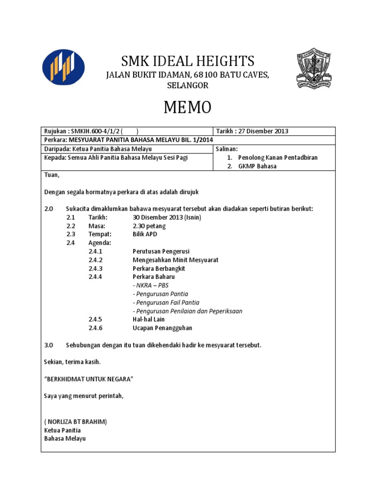 Pada akrtikel ini kami selaku admin akan memberikan contoh memo resmi dan memo tidak resmi. Namanya surat memo atau orang lebih sering menyebutnya memo, anda sudah tahu tentang memo? Agenda mesyuarat adalah seperti berikut; 3.1 ucapan penasihat 3.2 ucapan pengerusi 3.3 membentang dan mengesahkan minit mesyuarat lalu 3.4 perkara berbangkit 3.5. Sekolah kebangsaan kubang gajah km 7, jalan arau, 02600 arau,perlis.
